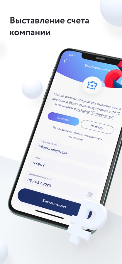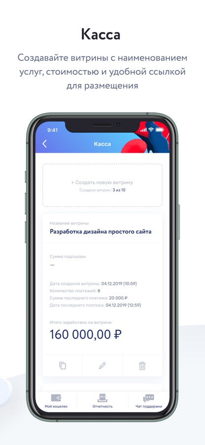 Формирование счета с реквизитами кошелька и наименованием услуги — прямо в приложении. После оплаты покупатель автоматически получит чек.