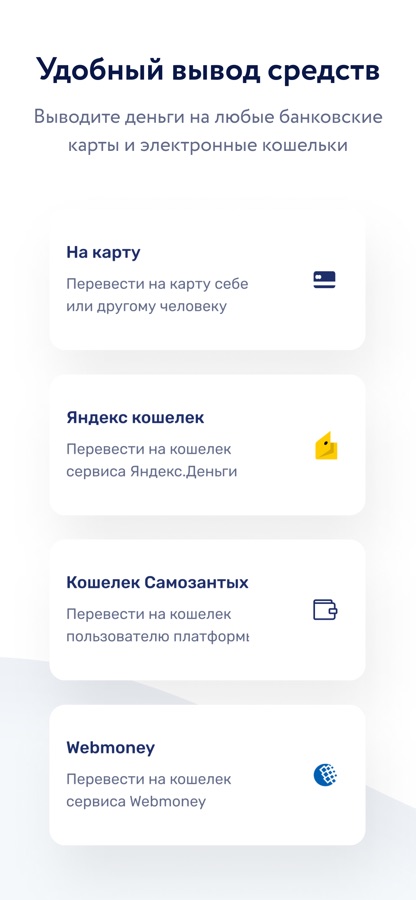 Вывод денег на любые банковские карты или электронные кошельки. Записи об операциях бережно хранятся в истории вашего личного кабинета.