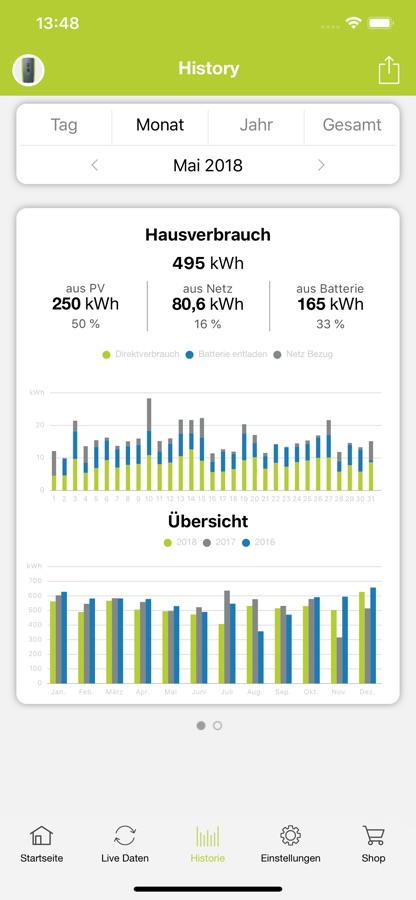 Unter „Historie“ können Sie sich die historischen Daten Ihrer Anlage grafisch darstellen lassen. Hier kann zwischen den Tages-, Monats-, Jahres- und Gesamtwerten des Hausverbrauchs und der Erzeugung gewechselt werden. Wechseln können sie diese Ansichten des Hausverbrauch und der Erzeugung wieder mit einer „Swipe-Aktion“.