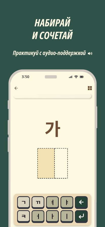 Kound — это удобное приложение для изучения корейского языка и алфавита. Оно поможет освоить корейские буквы шаг за шагом через понятные уроки, практику и слова. Вы сможете слушать правильное произношение, изучать, как звучит каждая буква, и заложить прочную основу для чтения.
