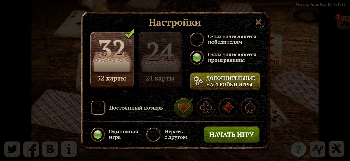 — Режим на 32 или 24 карты, на руках 8 или 6 (шестикарточный козел) карт соответственно