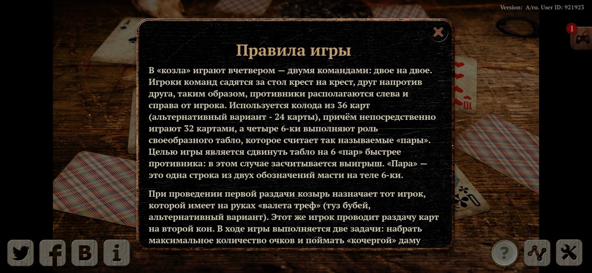 В нашу версии игры можно играть без интернета, тогда роль напарника будет играть искусственный интеллект. В игре достаточно сложные и интересные правила. Их описание есть в самой игре и если вы никогда не играли в Козла, то мы крайне рекомендуем с ними сначала ознакомиться.