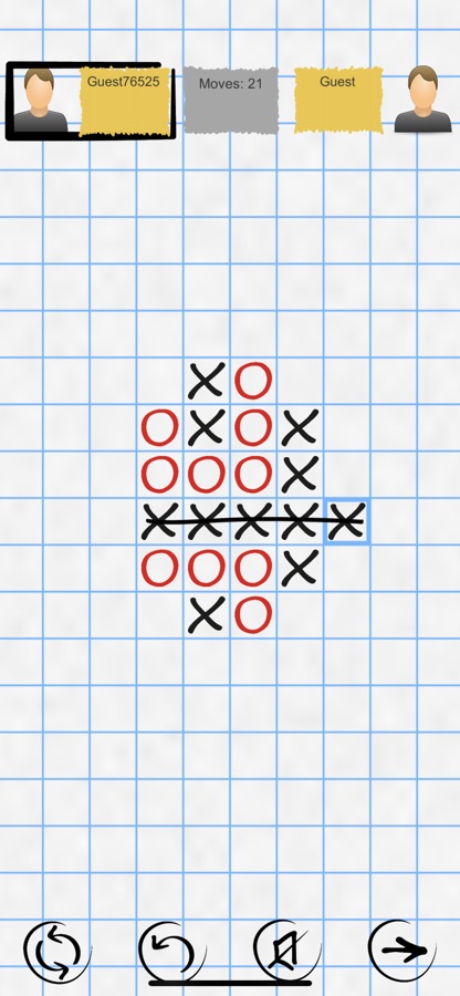 Чтобы выиграть, Вам прийдется создать 5 клеточек крестиков или ноликов в ряд бесконечном клеточном поле компьютера, оснащенного искусственным интеллектом и 5-мя уровнями сложности, или против друзей.