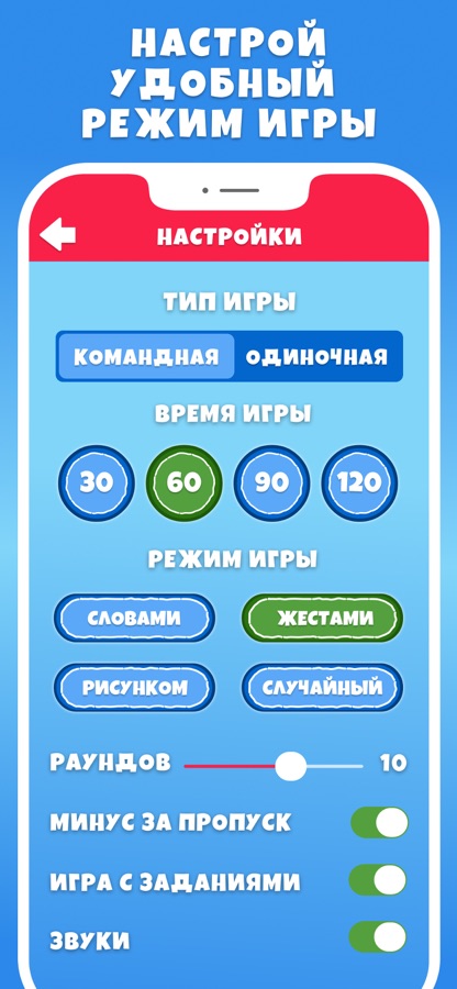 ► Настройте удобную для вас игру – установите время, количество раундов, задания, штрафы и другие параметры