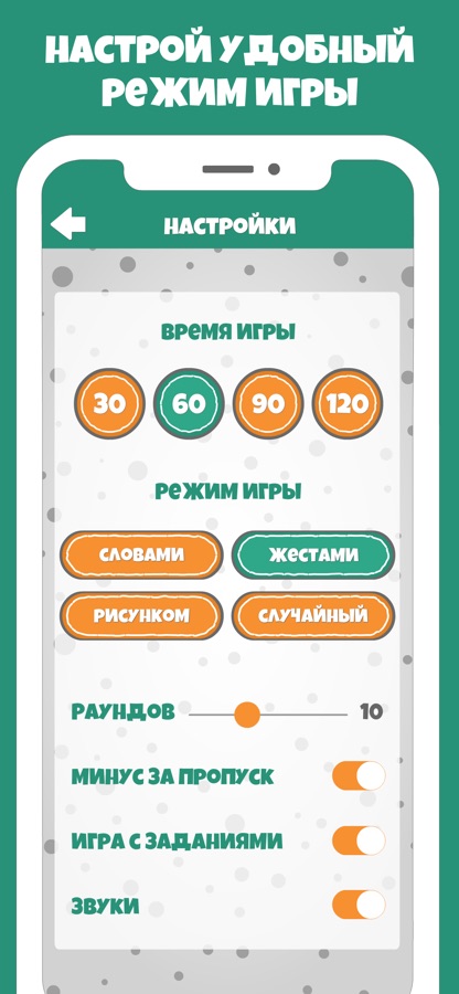 ►Настройте удобную для вас игру – установите время, количество раундов, задания, штрафы и другие параметры