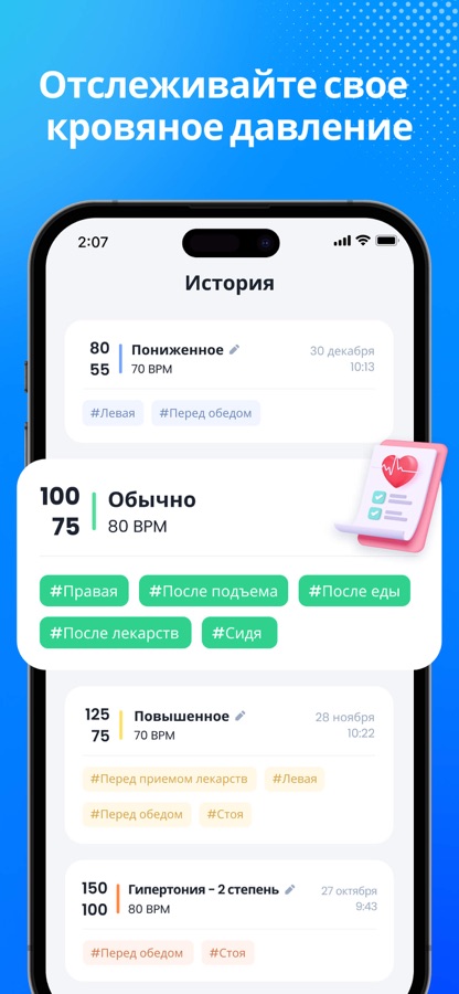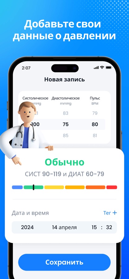 Откройте наше приложение для артериального давления — помощник для здоровья сердца. Отслеживайте давление, пульс, сахар в крови и насыщение кислородом. Точно фиксируйте и анализируйте данные для принятия разумных решений.