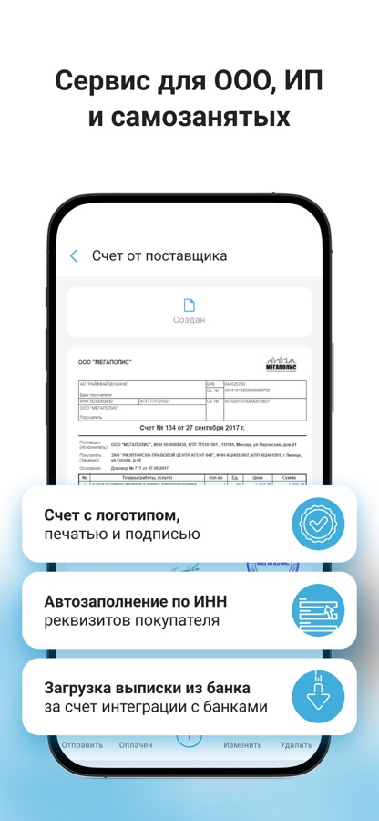 Выставляйте счета покупателям на ходу и ведите учет денег вашей компании. Также, вы можете легко и быстро просматривать документы (Акты, Накладные, Счета-фактуры, УПД), контролировать оплаты по счетам, отслеживаете долги покупателей и всегда под рукой иметь базу клиентов.