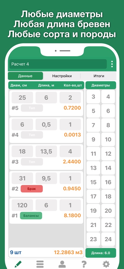 ► NEW !!! При долгом нажатии на диаметр бревна теперь добавляется новое бревно, а не суммируется с предыдущим: чтобы удобно было вводить бревна «Брак» и «Балансы»