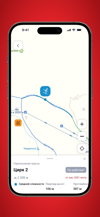 + определить свое местоположение и сориентироваться по интерактивной карте с канатными дорогами, трассами, сервисами и другими локациями курорта.
