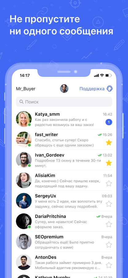 Чат. Общайтесь с фрилансерами и заказчиками в удобном мессенджере, обсуждайте детали будущего заказа, обменивайтесь файлами. Будьте всегда на связи.