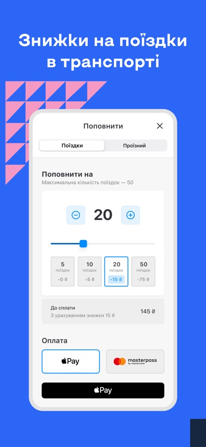Переглядайте міські маршрути та дізнавайтеся, коли прибуде автобус, тролейбус або трамвай. Поповнюйте цифрову карту поїздками зі знижкою та оплачуйте проїзд смартфоном.