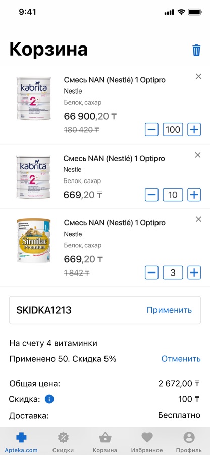 — Доставка заказа в любую из 1 000 аптек в 50 городах Казахстана;
