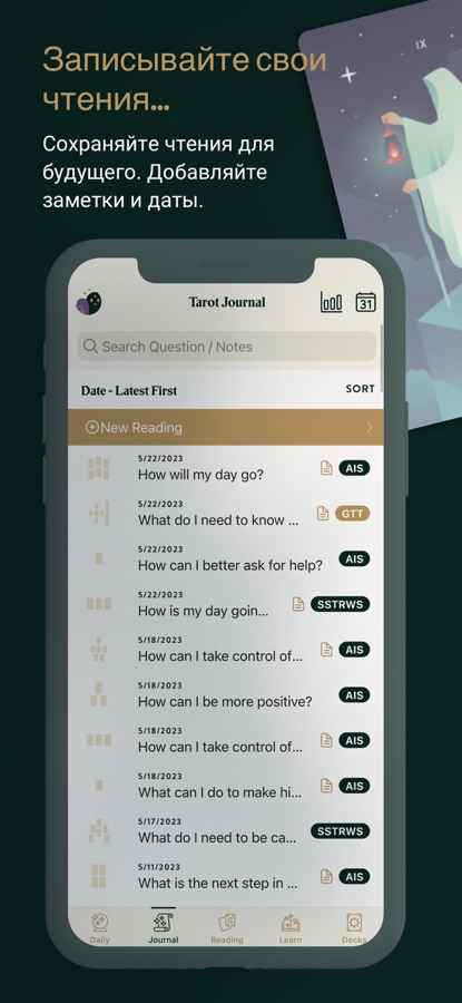 Журнальные таро чтения: Записывайте свои таро чтения в своем журнале. Добавляйте свои собственные заметки и вопросы ко всем вашим таро чтениям.