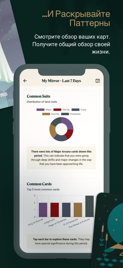 Пользовательские отчеты о чтении таро: Наша функция зеркала позволяет вам увидеть агрегированный вид всех ваших сохраненных чтений за определенный период времени. Узнайте, какая была самая распространенная карта, самый распространенный костюм или номер, а также ваш процент инверсий.