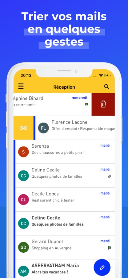 Grâce à son ergonomie des plus intuitives, vos messages sont faciles à rédiger et à classer depuis votre smartphone. Plus fluide, plus design, plus pratique, nul doute que vous succomberez bien vite à votre toute première application afin de pouvoir écrire, répondre et envoyer des mails et ce, où que vous soyez. L’interface est simple et facile d’accès.
