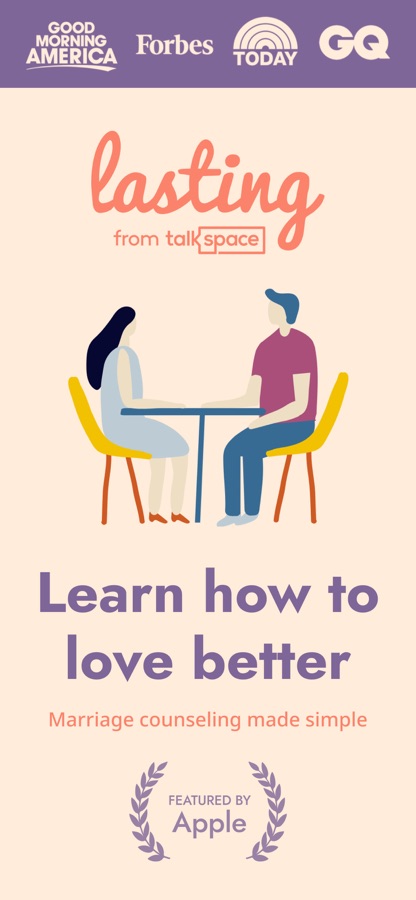 Lasting makes couples counseling simple. Build a healthier, happier relationship in a few minutes a day with the #1 marriage counseling app.