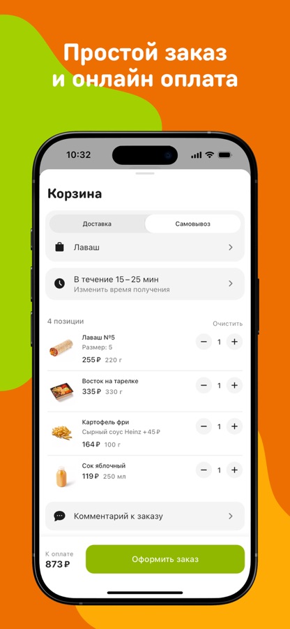 Как сделать заказ в приложении “Лаваш”: выберите понравившиеся позиции из меню, добавьте их в корзину и перейдите на экран оформления заказа (по нажатию на иконку корзины).