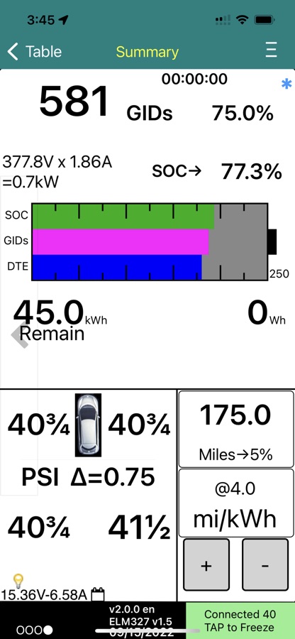 * Tire Pressure of each of the four tires with low pressure warning and delta pressure warning alarm (not yet supported on 2018 Leaf)