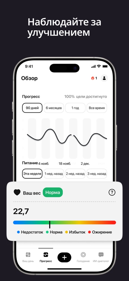 — Динамика прогресса. Наглядные графики помогут отслеживать изменения веса, тенденции потребления калорий, БЖУ и качество рациона.