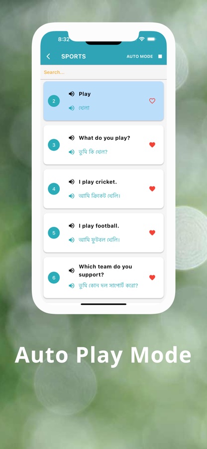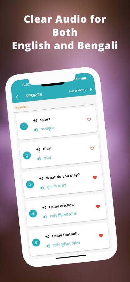 Всего 18 категорий для изучения бенгальского приложения и более 720 слов / предложений. Вы можете легко пометить свое любимое предложение для будущего использования.