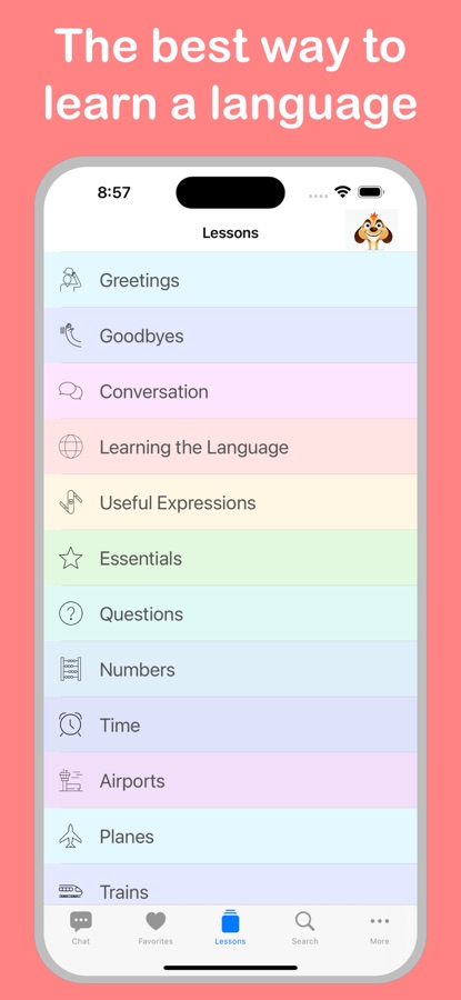 • 101 lessons for real-life situations like taking Taxis, arriving at a Hostel or asking about the Weather. Fun lessons such as Flirting and Swearing.
