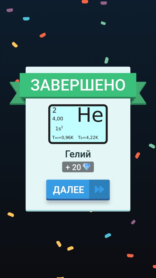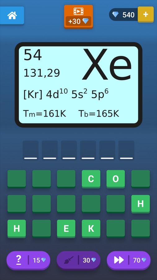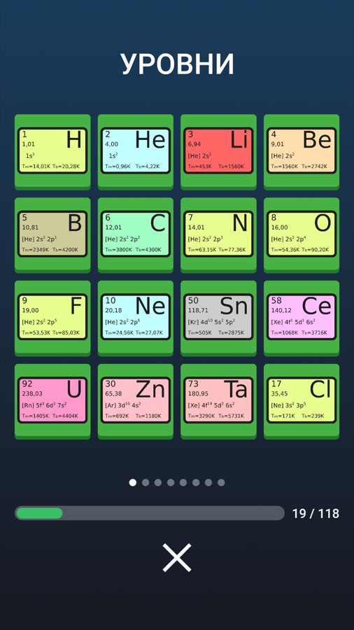 Угадай химический элемент, имея в распоряжении его символы, порядковый номер, атомную массу, электронную конфигурацию, а также температуры кипения и плавления. Блесни своими знаниями элементов периодической таблицы и не забудь ознакомиться со статьями, которые будут открываться по мере прохождения уровней. В них ты найдешь много интересной и полезной информации о каждом химическом элементе.