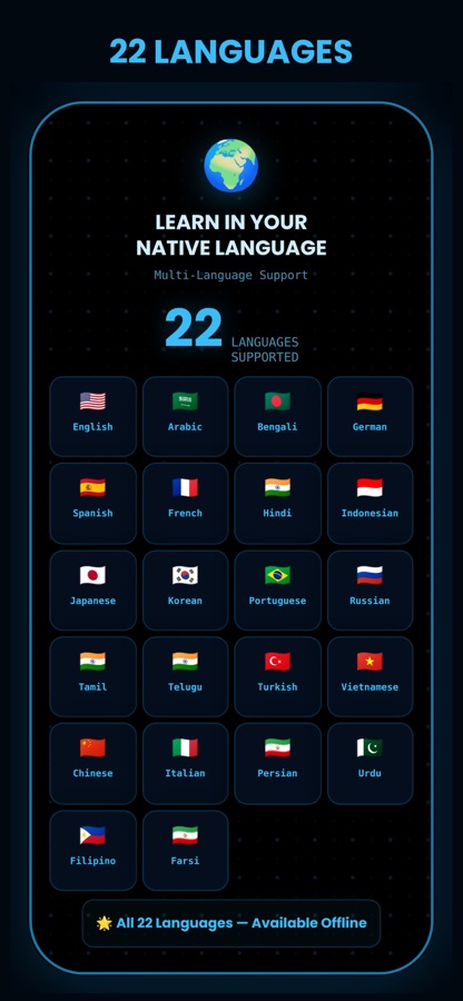 50+ structured modules. Full offline access. Multi-language support. Dark mode. Search and filter topics. Clean interface. Regular updates.