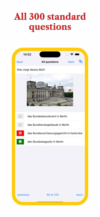 The Federal Office provides you with the complete catalog of examination questions approved for the «Leben in Deutschland» test, allowing you to prepare for the Einbürgerungstest. This catalog comprises a total of 310 questions, including 300 general questions and 10 questions specific to the respective federal state, which are to be answered only for that particular state.