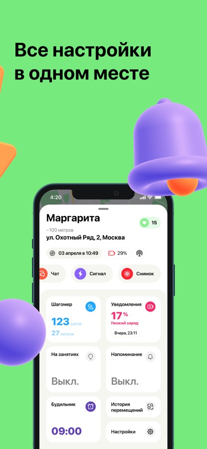 • Настройка безопасных зон и уведомления о перемещениях