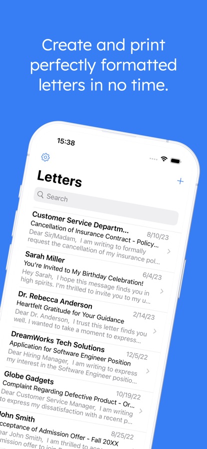 • Rapid search: Effortlessly locate previously drafted letters through a user-friendly search function.