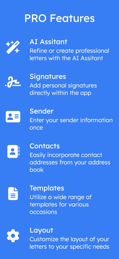 • AI-Powered Letter Assistant: Enhance clarity, structure, and tone effortlessly. Whether refining a draft, generating a complete letter from a subject, or seeking inspiration, the AI Assistant ensures professional, well-structured results in multiple languages.
