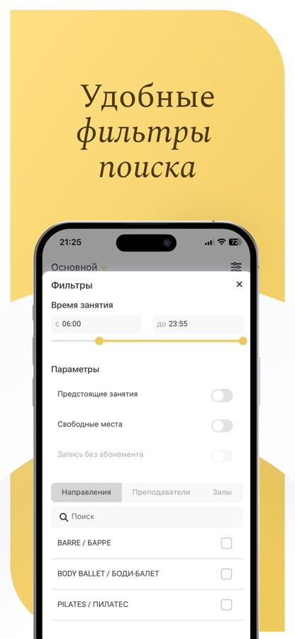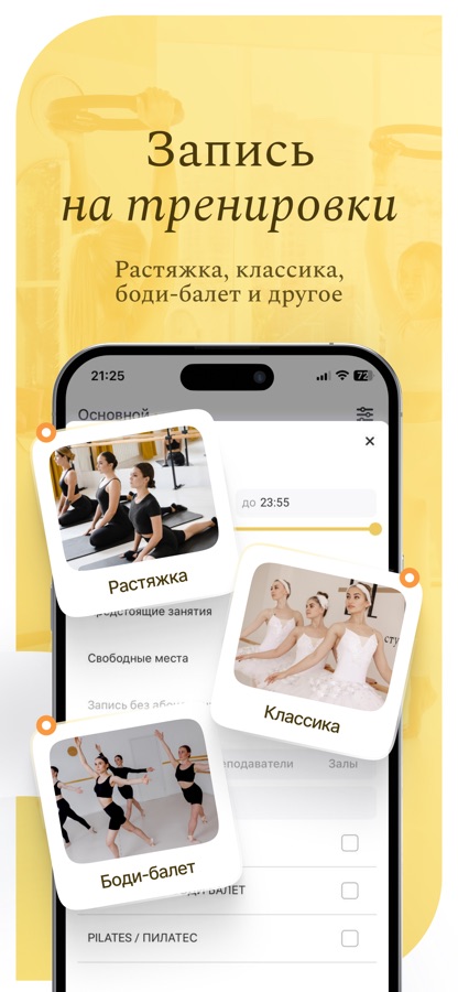 Теперь всё, что важно, всегда под рукой: быстрая запись на занятия, актуальное расписание, программа лояльности, персональный профиль с историей посещений и свежими новостями студии.