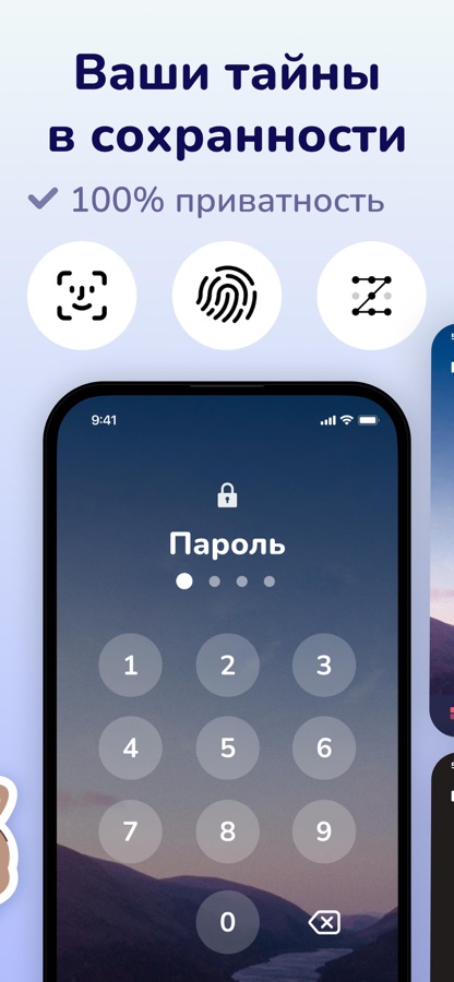 Ваша конфиденциальность — наш главный приоритет! Вы можете установить блокировки с различными вариантами, включая PIN-код, Face ID и блокировку отпечатка пальца (скоро), гарантируя, что ваши записи останутся конфиденциальными и доступными только вам.