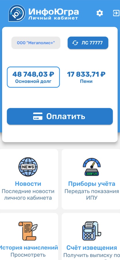 Привязывайте лицевые счета, просматривайте начисления, вносите показания, совершайте оплаты всего в пару нажатий.