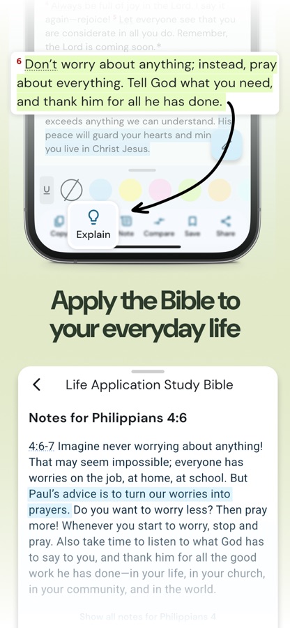 • One-Tap Insights: Instantly find the meaning behind any verse with the «Explain» feature or see how it reads across different versions with «Compare.»