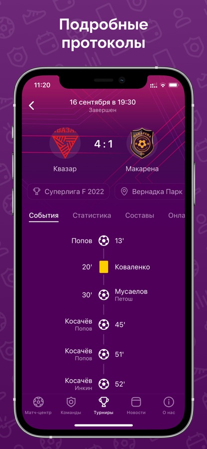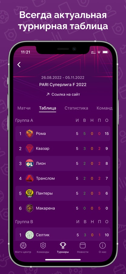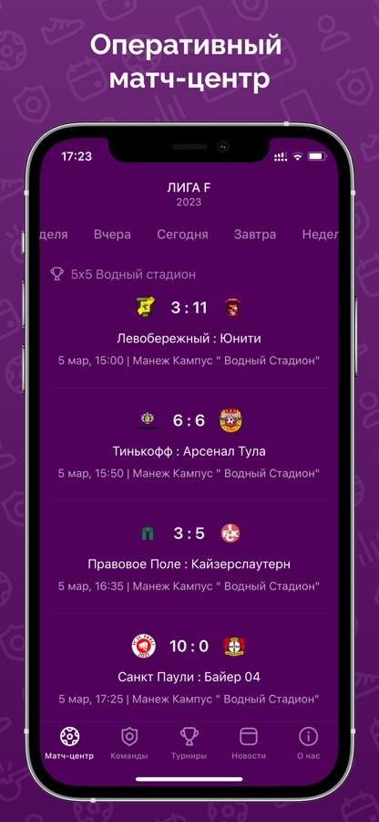 В приложении вы найдете актуальную информацию о турнирах ЛИГА F: календарь матчей и результаты, оперативный матч-центр и подробные протоколы, турнирную таблицу и персональную статистику