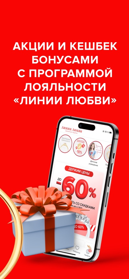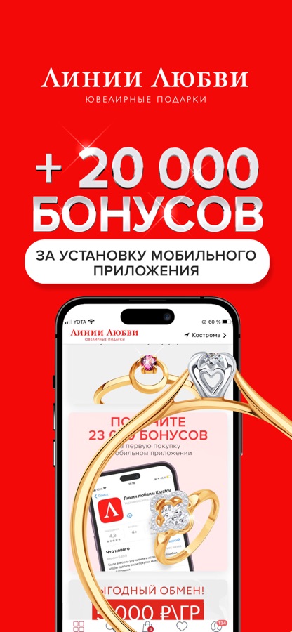 Линии Любви — это розничная сеть из более 130 магазинов по всей России, в более 60 городах присутствия. Сделайте подарок себе и близким с нашим мобильным приложением: у нас вас ждет выбор из более 10 000 товаров — кольца из красного, желтого и белого золота, цепи, серьги, детские украшения, обручальные и помолвочные кольца и многое другое. В вашем распоряжении удобный каталог, фильтры и поиск по товарам, а за скачивание мобильного приложения вас ждут подарочные 1000 бонусных баллов на счет!