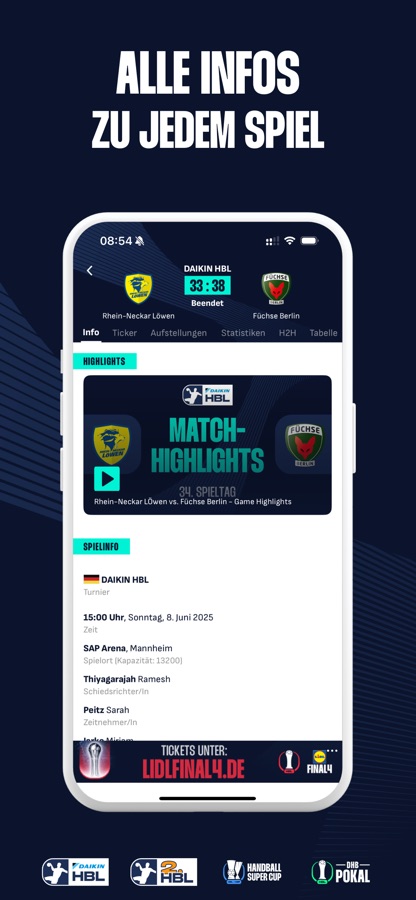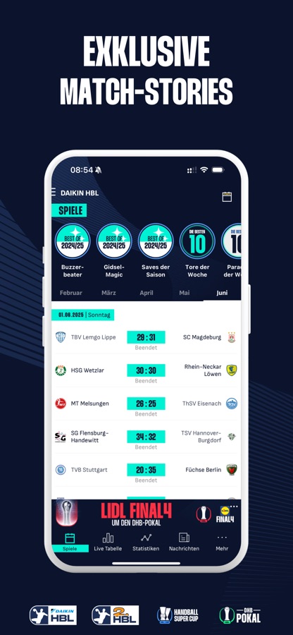 Mit der offiziellen App der DAIKIN Handball-Bundesliga bist du näher dran als je zuvor. Erlebe die Emotionen der „stärksten Liga der Welt“ live und verpasse keine Entscheidung mehr – alles, was du als Fan brauchst, in einer einzigen App.