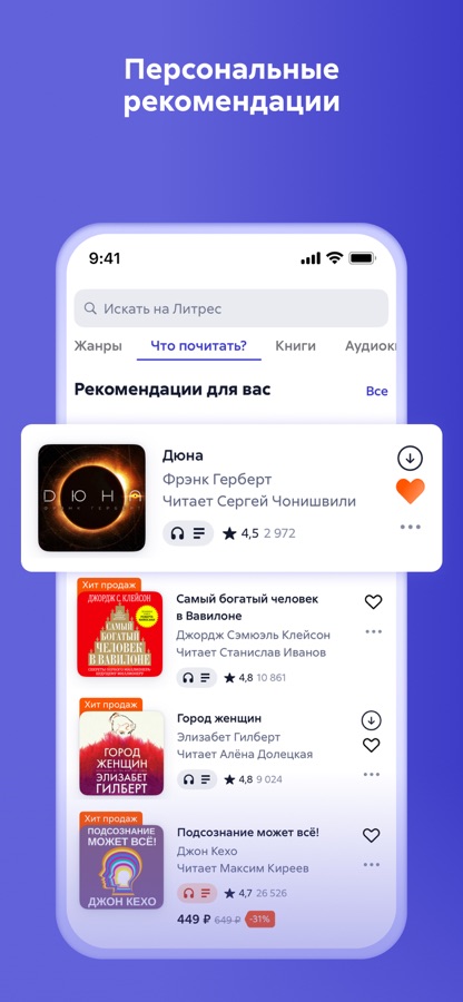 — Получать умные рекомендации на основе истории чтения и вашей электронной библиотеки.