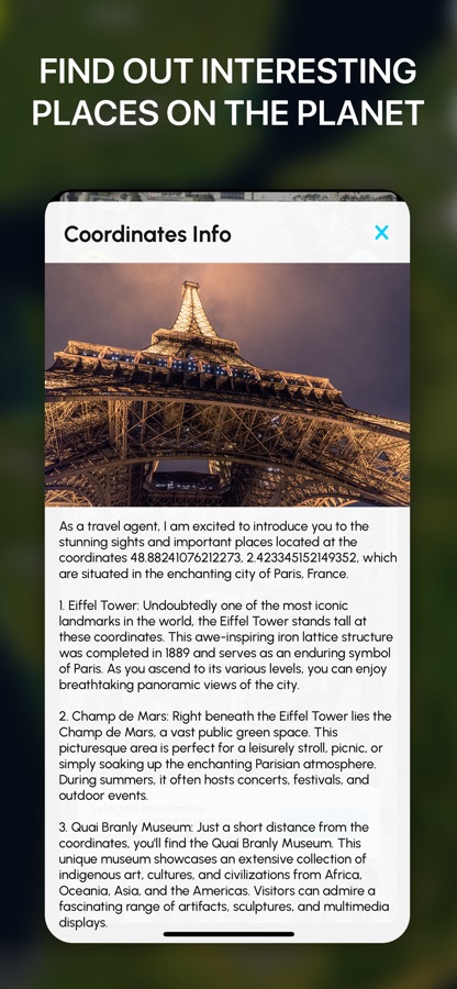 1. Описание точки: При выборе какой-либо точки на карте пользователь может получить подробное описание этой точки, включая информацию о достопримечательностях, географических особенностях, истории и других интересных фактах.