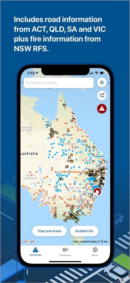 This app also uses data from interstate road agencies (QLD, SA, VIC and ACT), NSW Rural Fire Service, and Northern NSW local roads (myroadinfo.com.au).