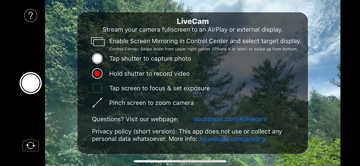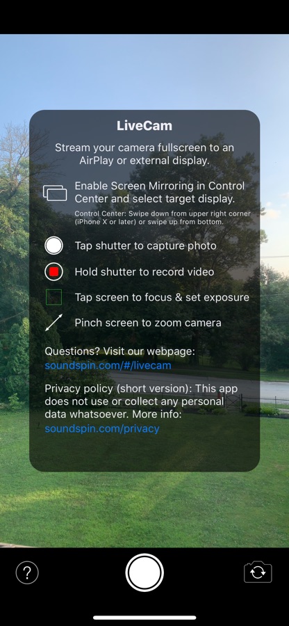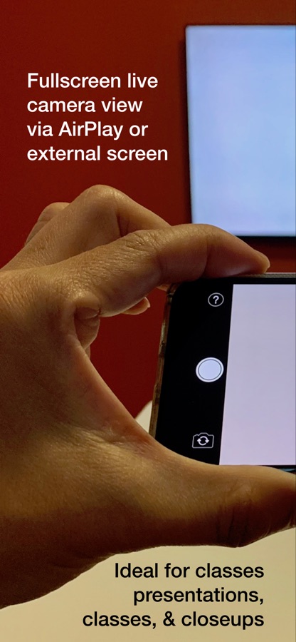 LiveCam is built for a single purpose: to stream your iPhone camera fullscreen to an AirPlay® or wired external display without any distracting elements. Your audience sees only what you want them to see, a fullscreen camera view, without any additional controls or interface elements.