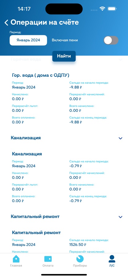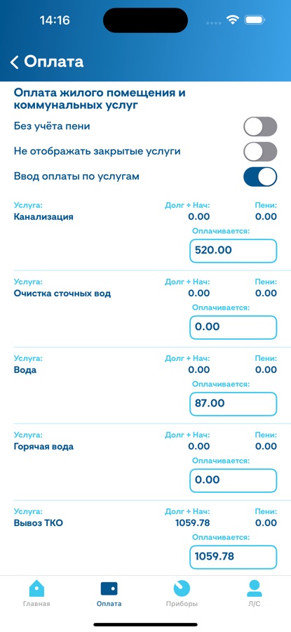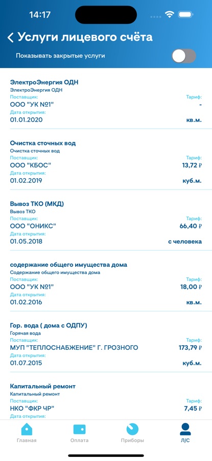 — Посмотреть используемые приборы учёта, ввести их показания, просмотреть историю показаний