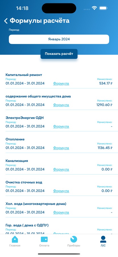 — Посмотреть подключенные услуги и формулы расчётов начислений по ним