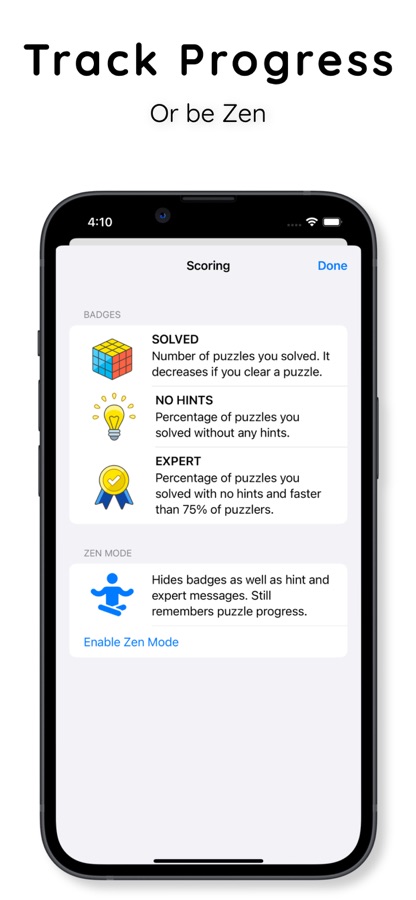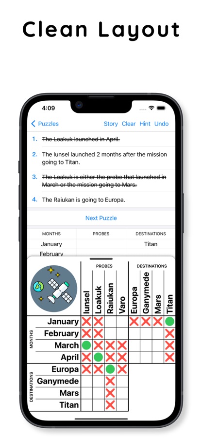 Learn and enjoy Logic Puzzles with 100 unique puzzles of increasing difficulty and multiple sizes. Decode written clues & fill in the grid to solve each puzzle. Work your way up from from beginner to master! Use the unlimited Smart Hints to see exactly which clue applies to the current board and why. Start with small 3×4 puzzles and challenge yourself with huge 4×7 cell puzzles.
