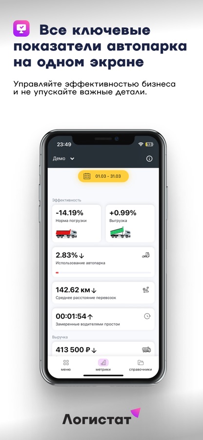 • Оценивает эффективность работы автопарка — норма погрузки, среднее расстояние с грузом, замер простоев, использование техники