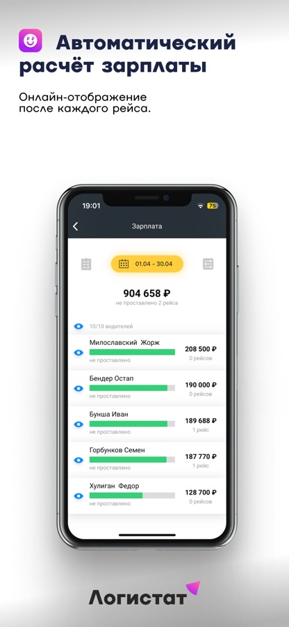 • Автоматически рассчитывает зарплату водителей онлайн — с отображением в мобильном приложении сразу после завершения рейса