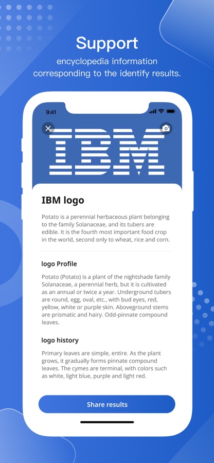 Используйте новейшую технологию распознавания логотипов AI, чтобы мгновенно идентифицировать логотипы Google, Youtube, Instagram, Apple, Coca-Cola, IBM, Huawei и других брендов!