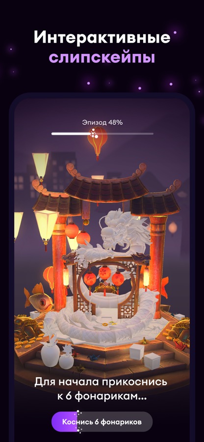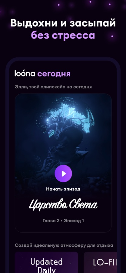 С момента пробуждения и на протяжении всего дня Loóna поддерживает ваше эмоциональное состояние. Каждый вечер вы получаете доступ к рекомендуемому слипскейпу, или эпизоду. Каждый эпизод — это интерактивная история, которая уникальным образом сочетает в себе увлекательное повествование и расслабляющую музыку. Проходя слипскейп, вы оставляете позади тревожные мысли, перезагружаете свой разум и создаете идеальное настроение для здорового сна.