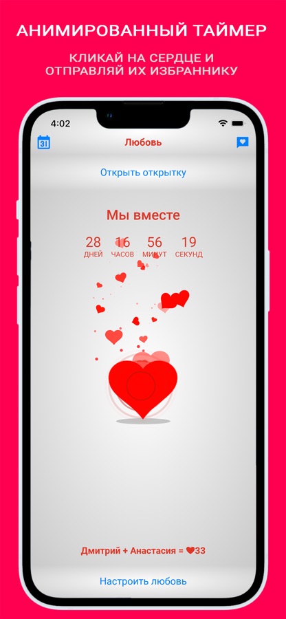 В приложении можно самостоятельно выбрать дату, когда любовь началась. Открыв главный экран можно сразу видеть таймер сколько дней вместе. Во первых, это такой счетчик отношений и счетчик любови, а во вторых, возможность понять совместимость на основе периода сколько мы вместе и совместного опыта, то есть какие важные события остались в истории любви и ещё ждут впереди.